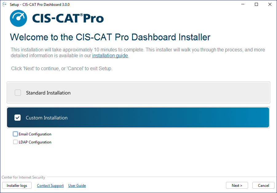 For an initial CIS-CAT Pro Dashboard installation on Microsoft Windows, follow the basic steps below. CIS-CAT has observed an initial installation effort on a prepared server to complete in less than 10 minutes. As the installation process will effect the Java home environment variables on the machine, CIS-CAT recommends that other applications requiring a system-installed java run time environment (JRE) are not present on the same host.