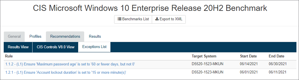 Exceptions List - All active exceptions applicable to this benchmark. Exceptions can be applied to a single test result, via a tag assigned to the target system, or global for all systems for that CIS Benchmark version.